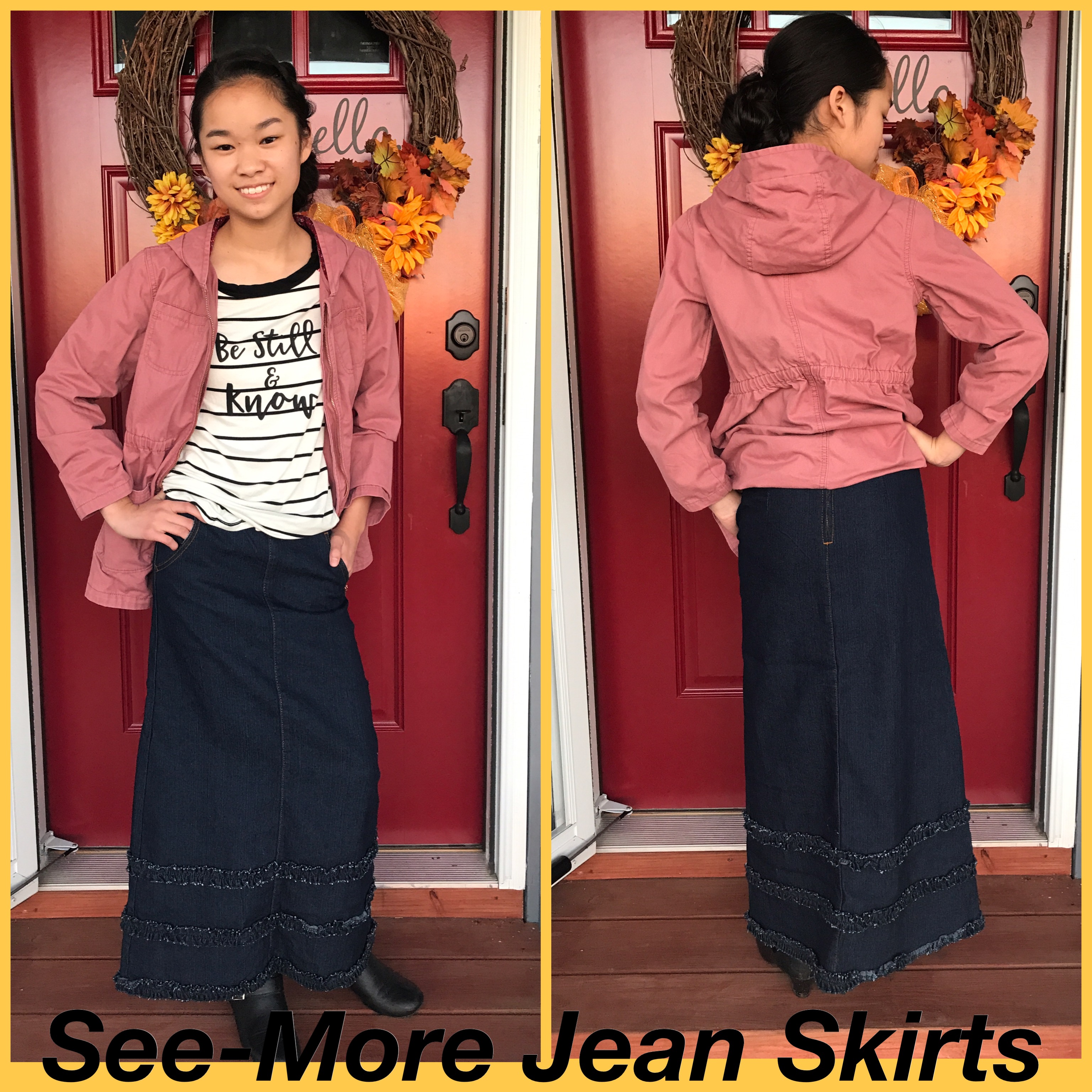 GIRLS LONG DENIM SKIRT WITH RUFFLE TRIM NO SLITS, NO FLY, FRONT POCKETS WAIST: S-24, M-25, L-26 LENGTH: S-27, M-30, L-32