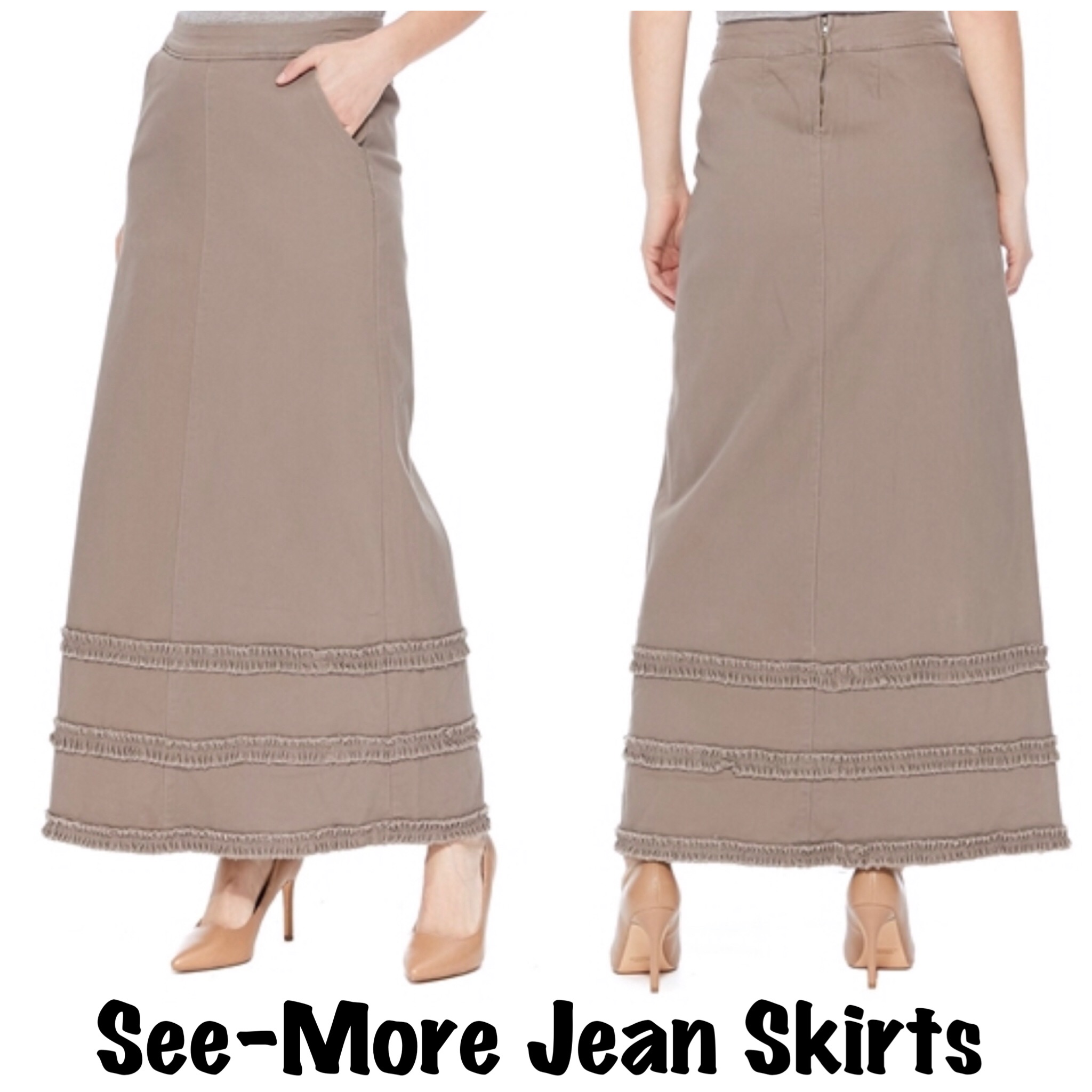 TORI KHAKI TRIPLE RUFFLE TRIM LONG DENIM SKIRT