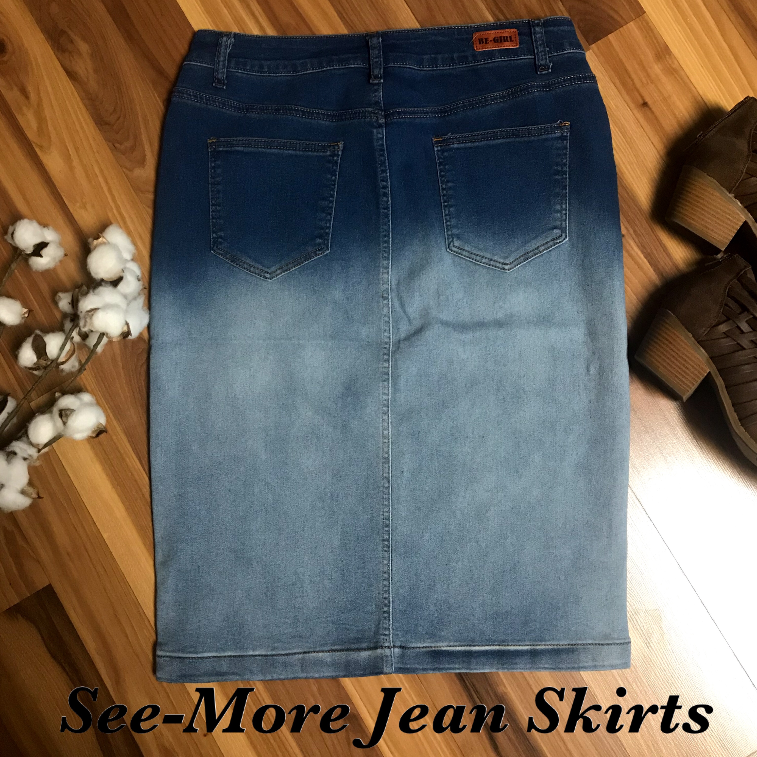 Blue Blush stretch denim Ombre pencil skirt with pockets and zip-fly/button closure, no slit... Length: 27 Waist/Hip Measurements: