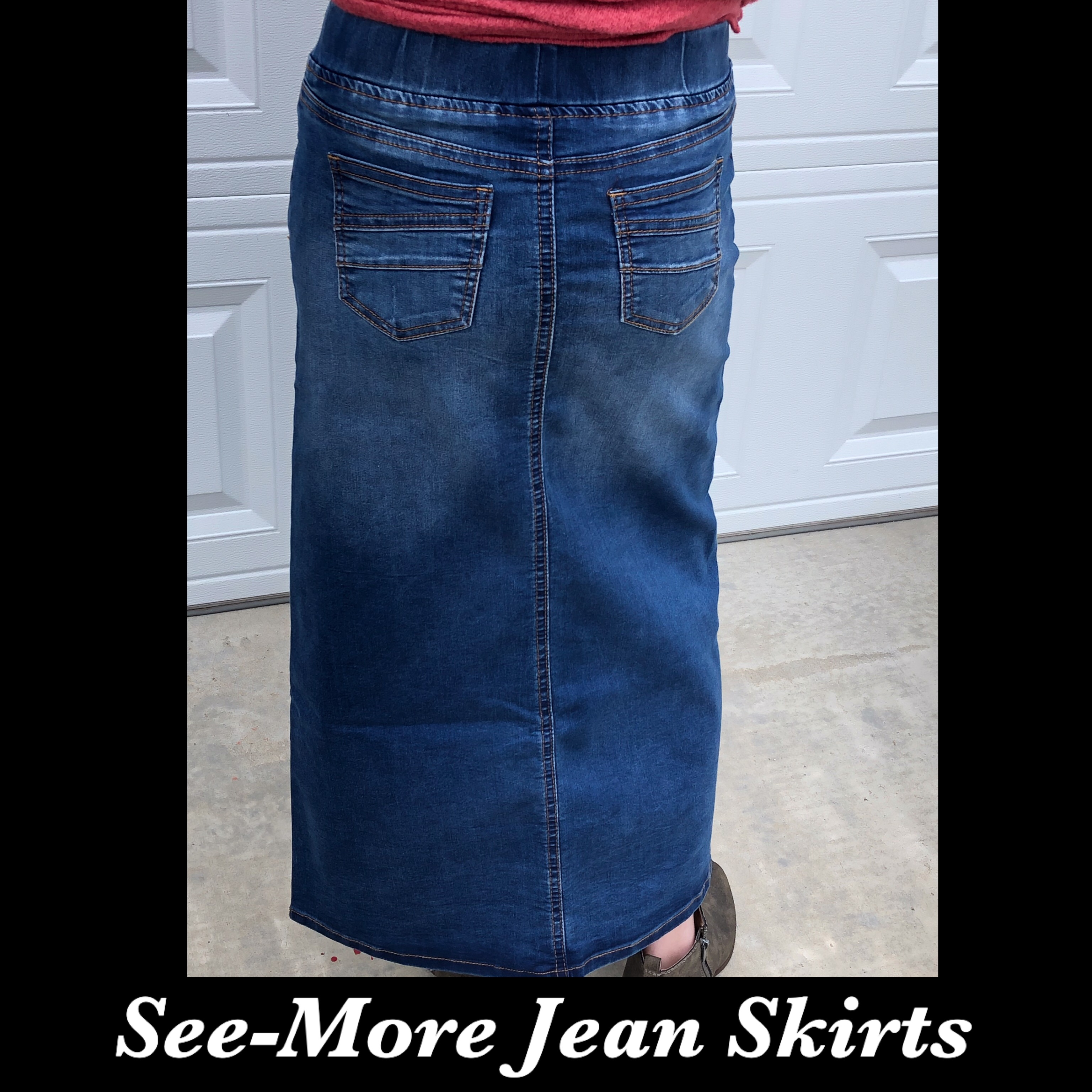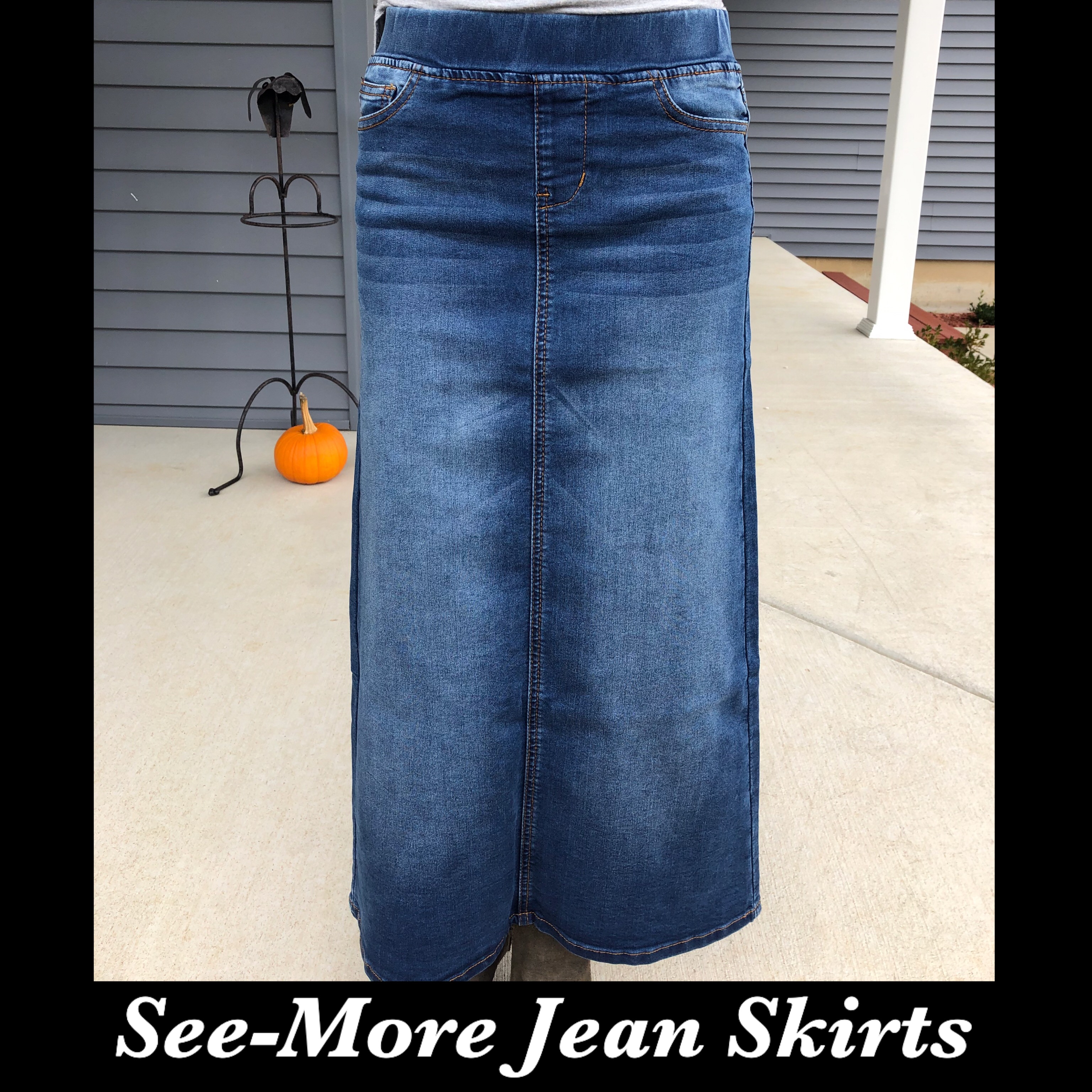 INDIGO WASH DENIM SKIRT WITH ELASTIC WAISTBAND THAT STRETCHES UP TO 4 INCHES.... WAIST: S-22-24 LENGTH: 26 M-24-26 LENGTH: 30 L-26-28 LENGTH: 32