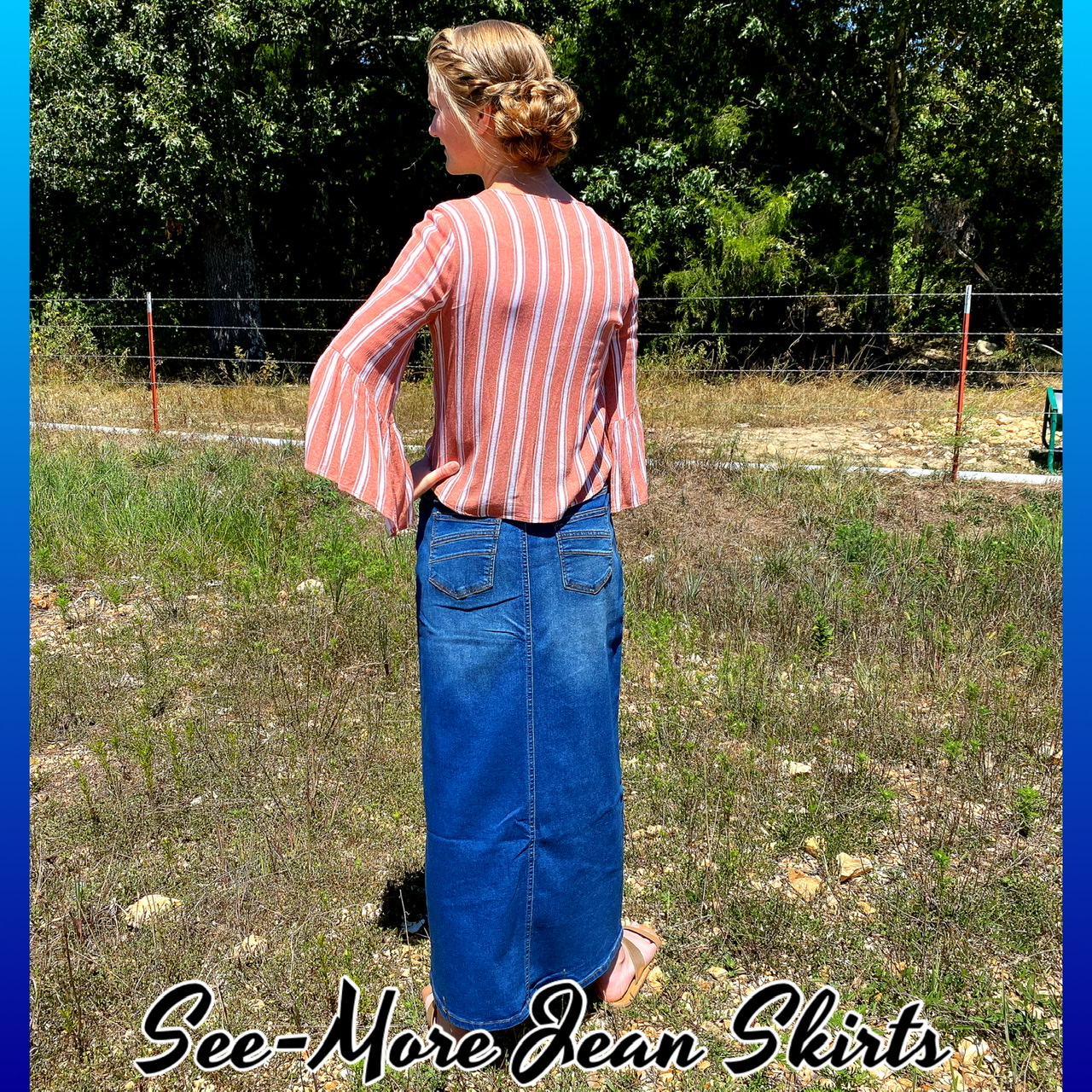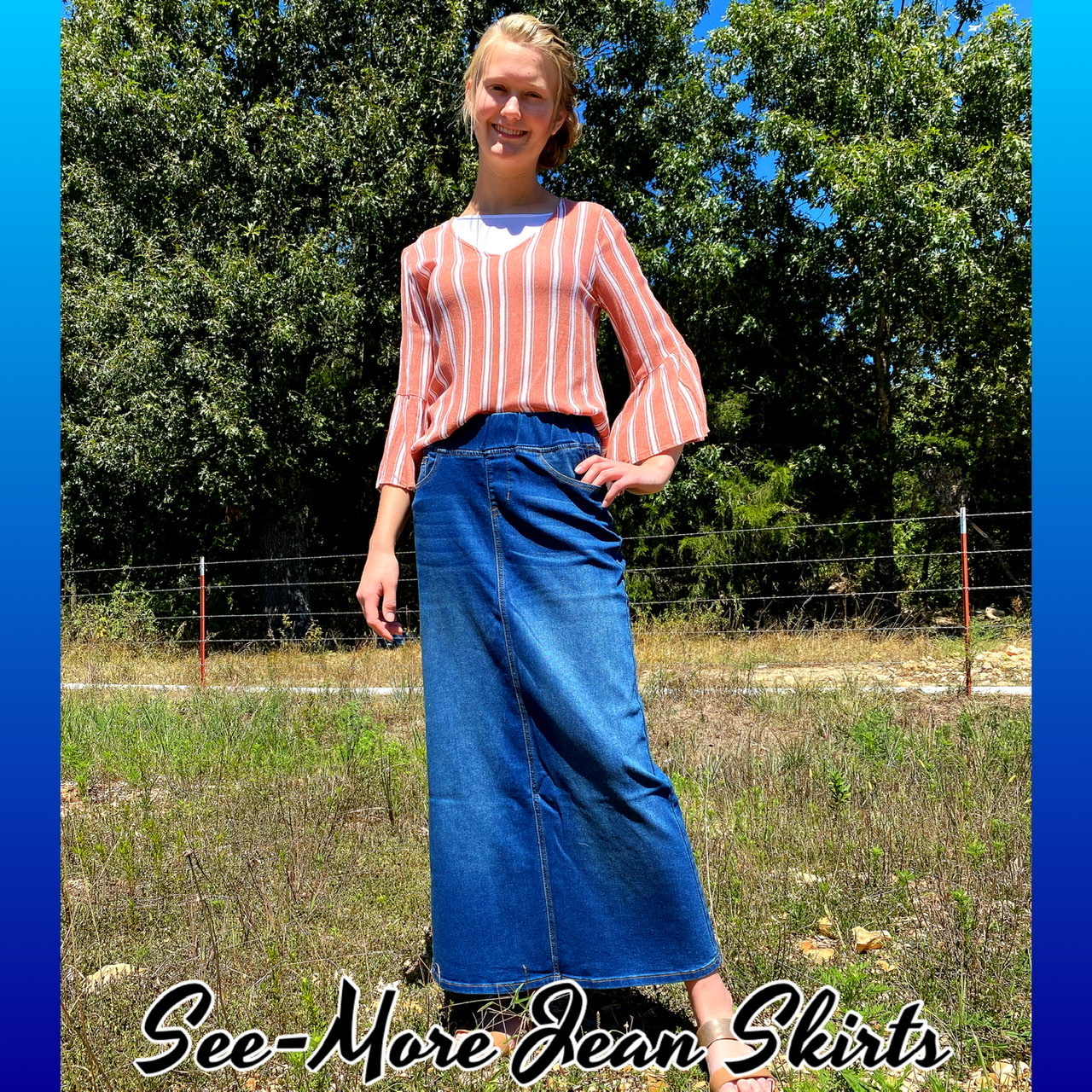 LONG DENIM SKIRT WITH STRETCHY WAISTBAND (Stretches up to 3 inches) No Slits... Length: 38 Waist/Hip: XS: 26/36 S: 29/37 M: 31/39 L: 33/41 XL: 35/43 2X: 37/45 3X: 39/47