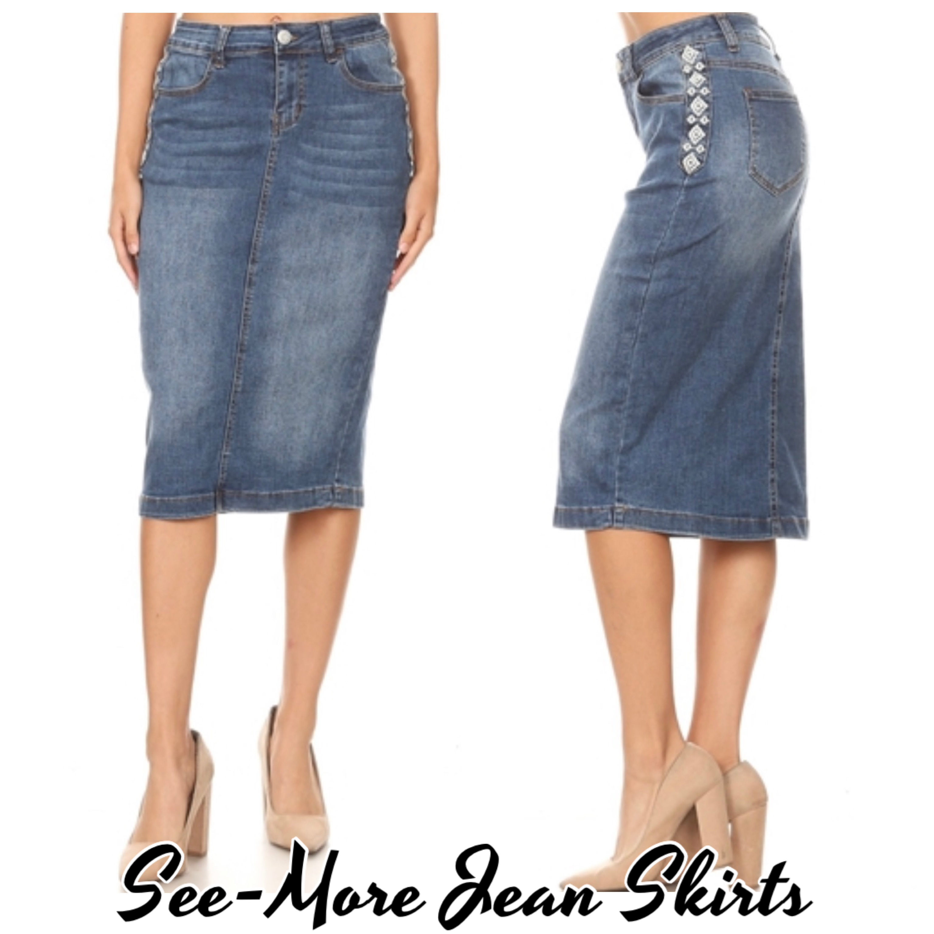 Indigo wash denim with diamond print embroidery on top sides No Slits... Length: 27 Waist/Hip Measurements: XS: 28/35 S: 30/37 M: 32/39 L: 34/41 XL: 36/43 2X: 38/45 3X: 40/47