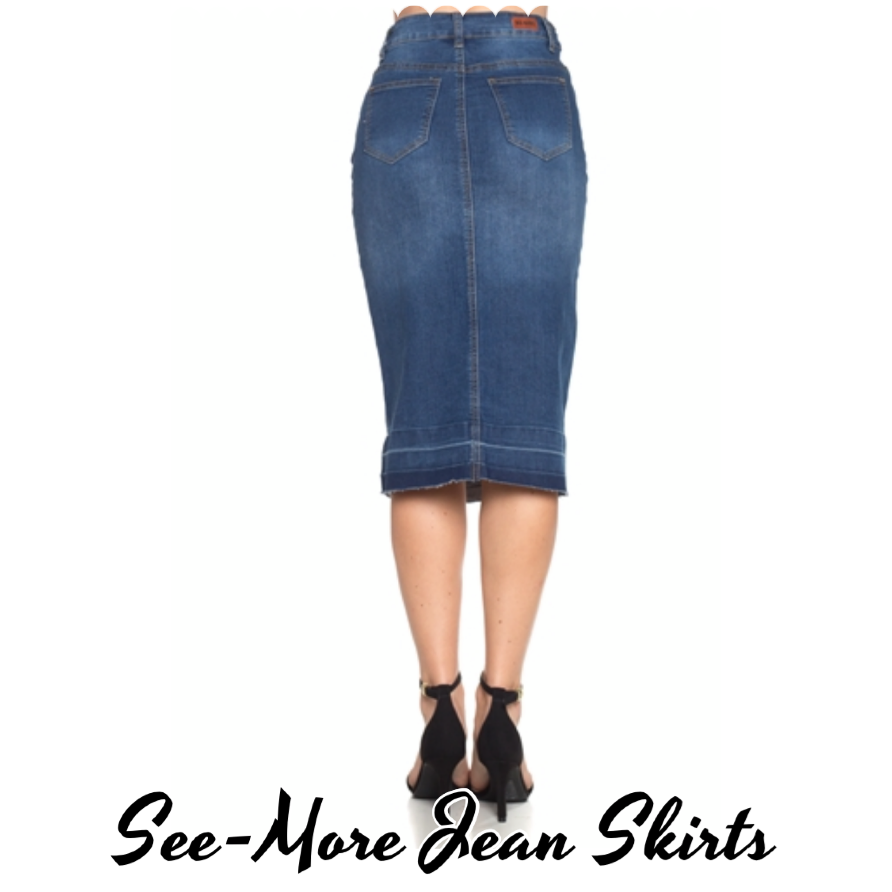 Indigo Wash Mid Length Denim Skirt No Slits Length: 28 2% Spandex Waist/Hip Measurements: XS: 28/34 S: 30/36 M: 32/38 L: 34/40 XL: 36/43 2X: 38/45 3X: 40/47