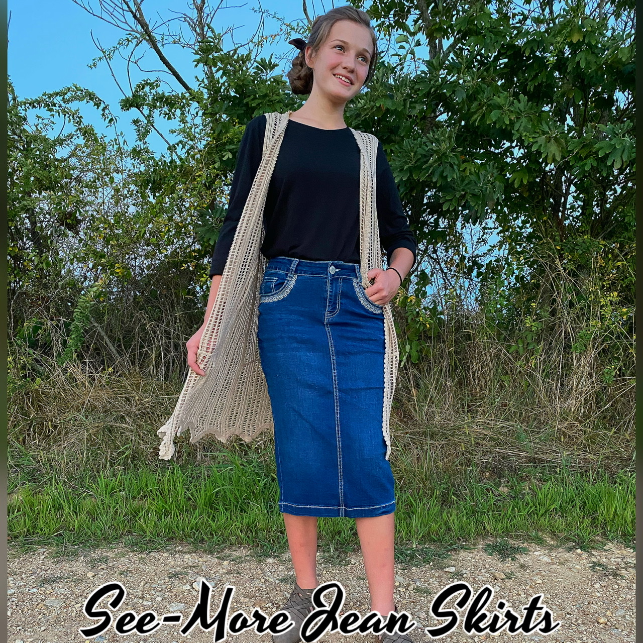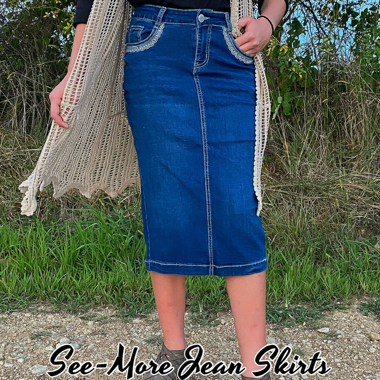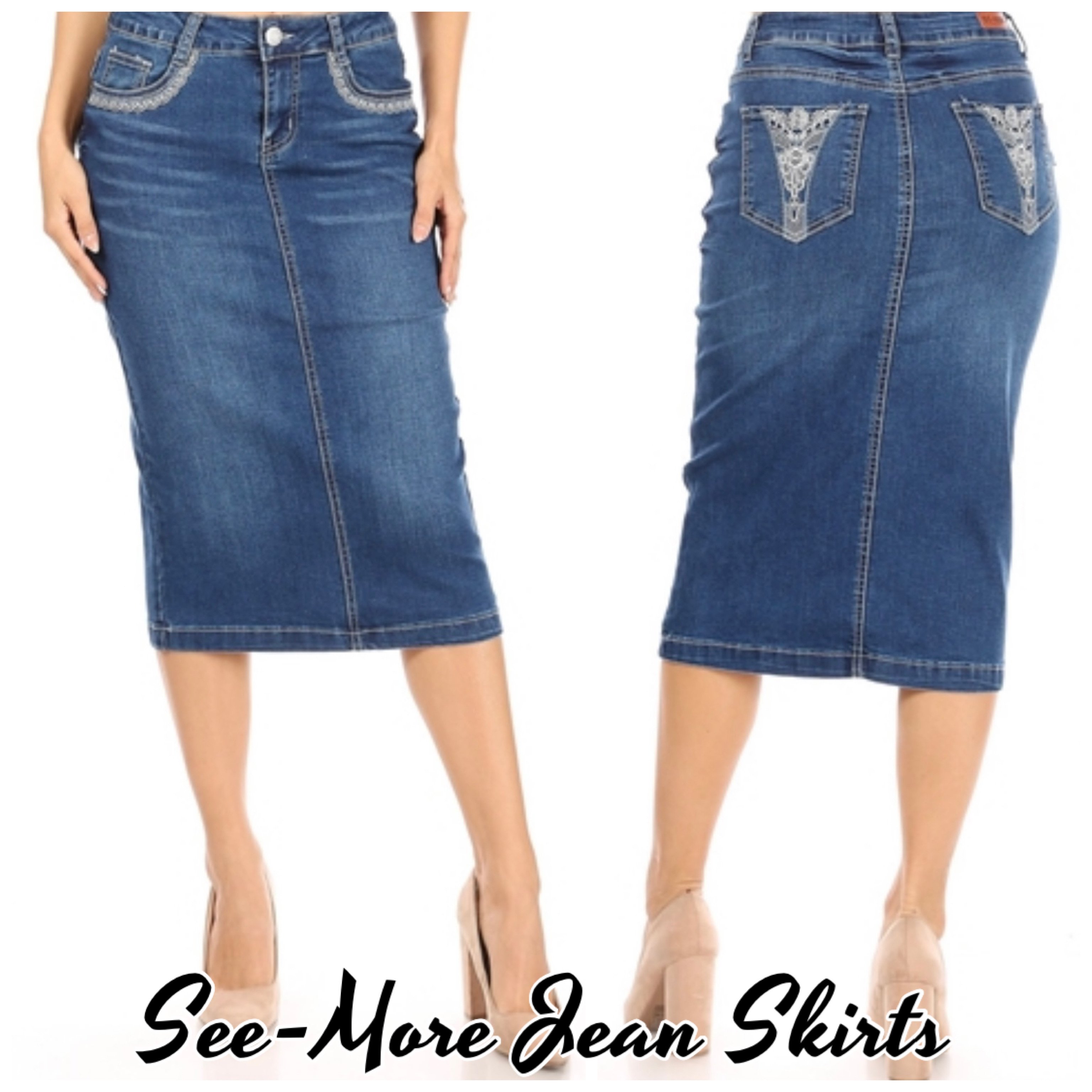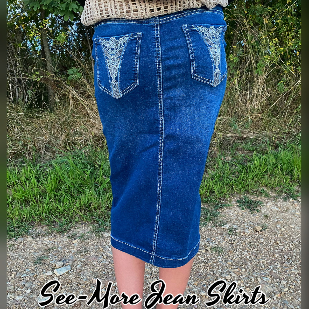 Stretch Indigo denim, calf length pencil skirt with embroidered detail Length: 28 Waist/Hip Measurements: XS: 27/34 S: 29/36 M: 31/38 L: 33/40 XL: 35/42 2X: 37/44 3X: 39/46