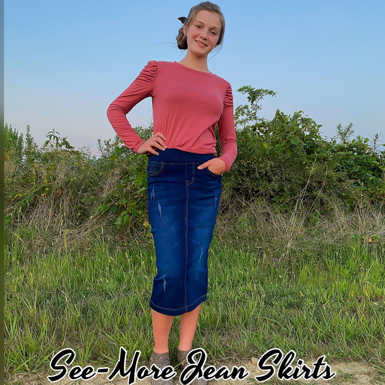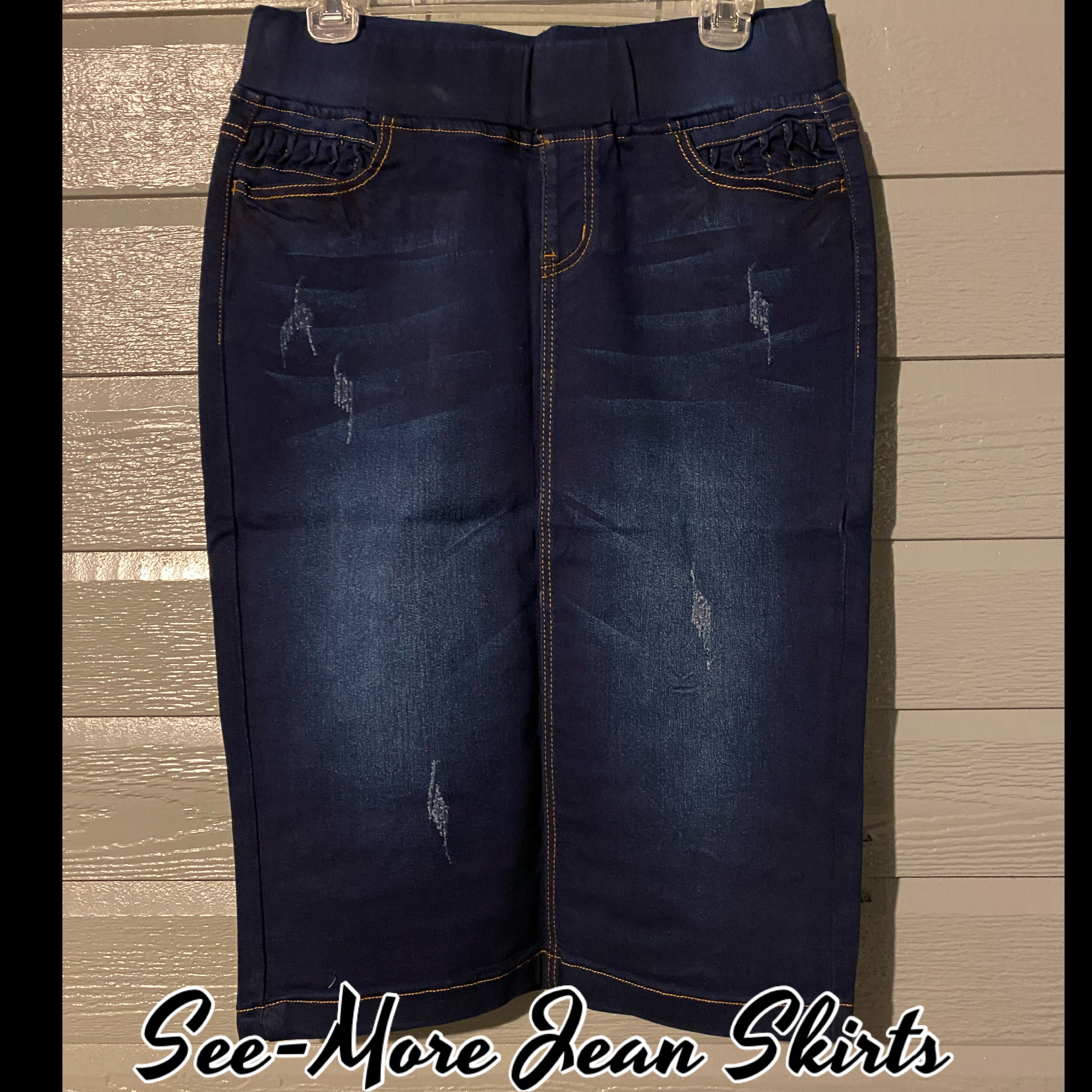 Classic Comfort Distressed & Pleats Mid Length Denim Skirt