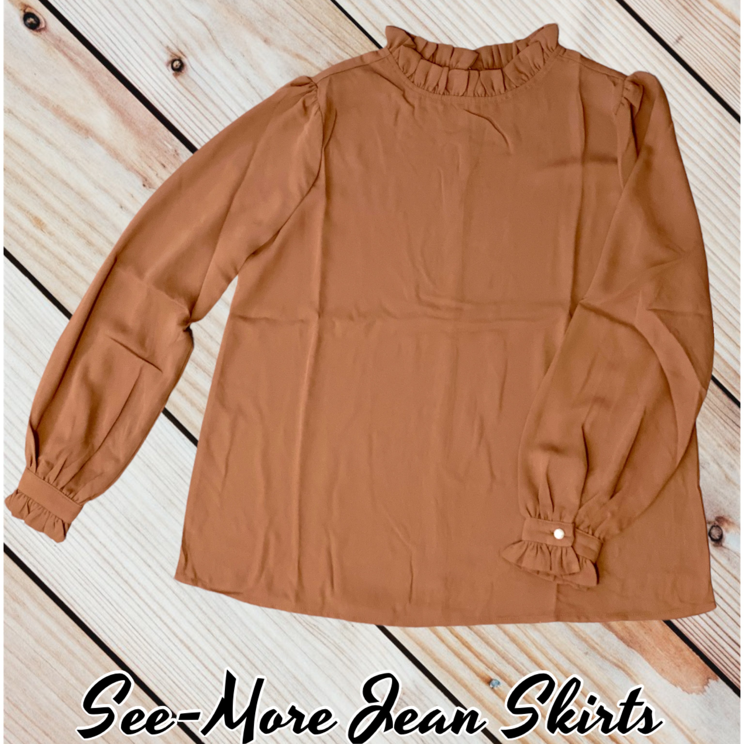 Faith Ruffled Trim Long Sleeve Blouse-Cream, Camel, Black, Navy, Mustard
