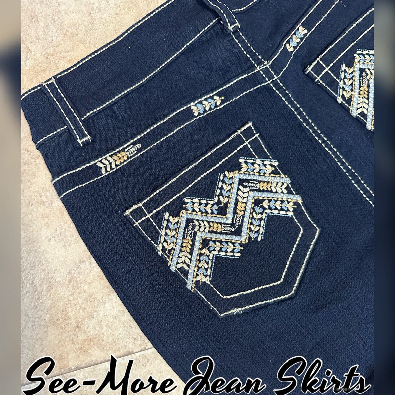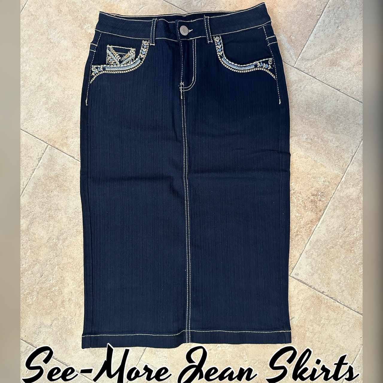 Stretch dark denim, pencil skirt with a button/zipper closure, pockets on the front and back, embroidery embellished, no slit Waist/Hip: XS: 26/34 S: 28/36 M: 30/38 L: 32/40 XL: 35/42 2X: 38/44 3X: 40/46 Length: 28