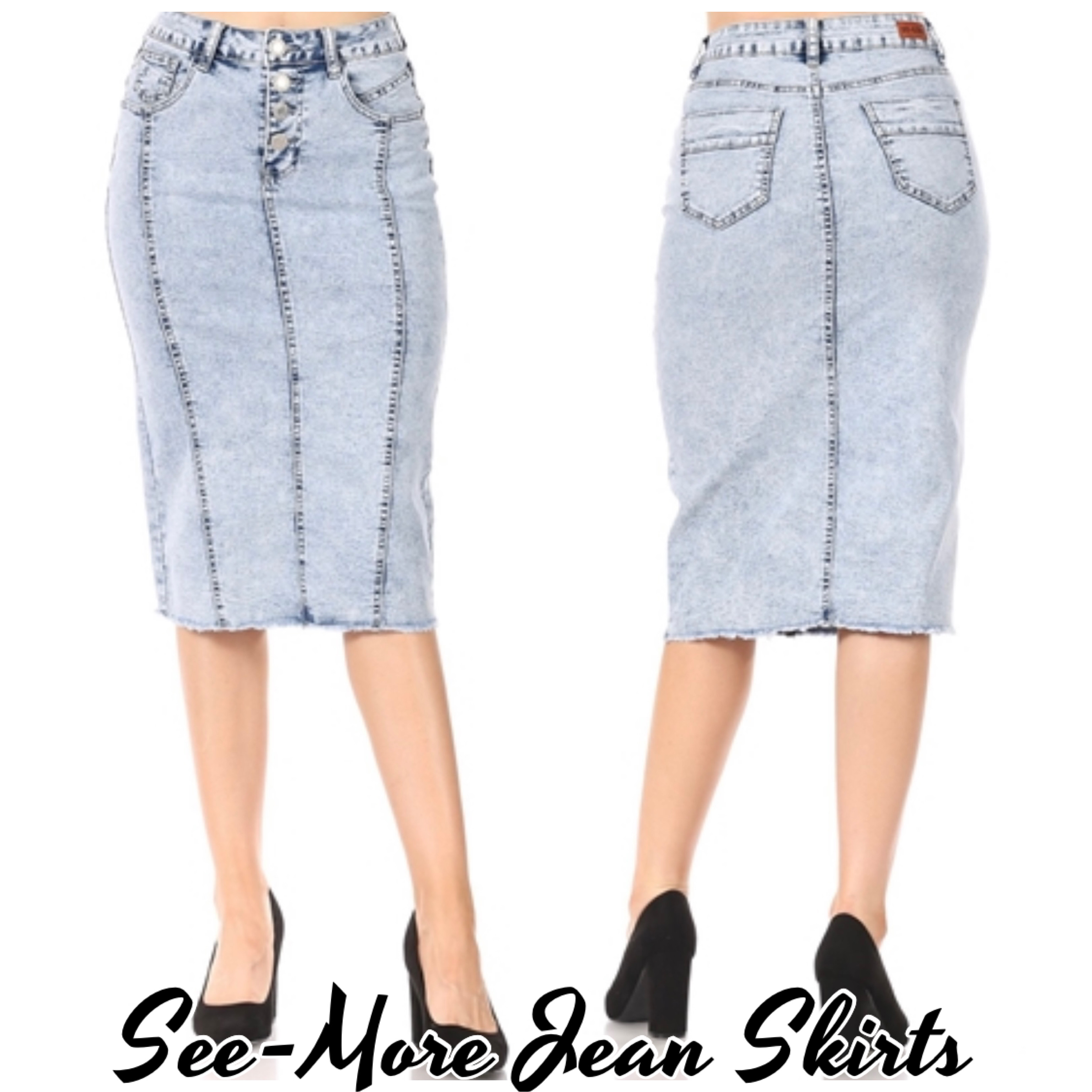 Calf-length skirt with button-down opening, no slit, raw hem Length: 27 WAIST/HIP MEASUREMENTS: XS: 26/35 S: 28/37 M: 30/39 L: 32/41 XL: 34/42 2X: 38/45 3X: 40/47