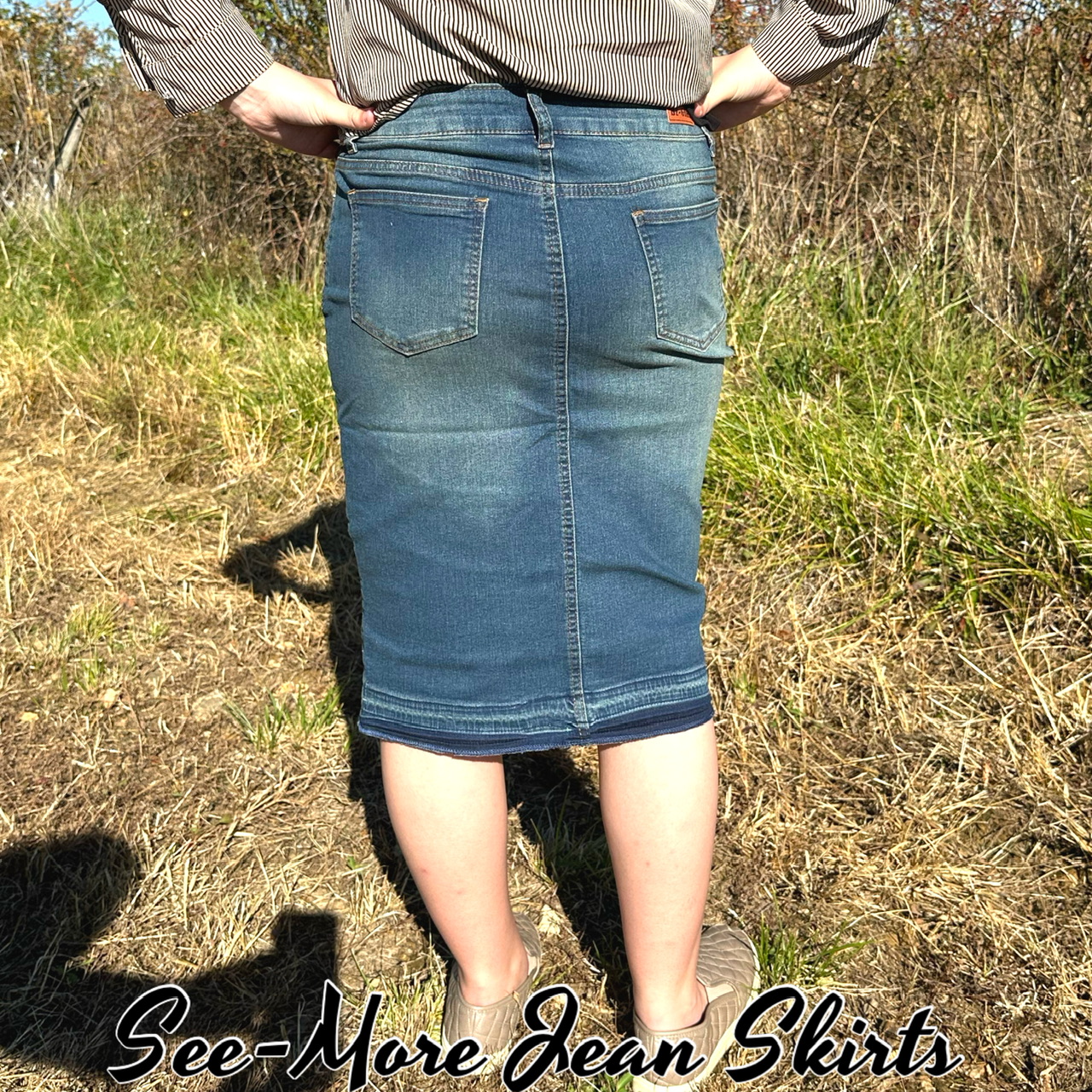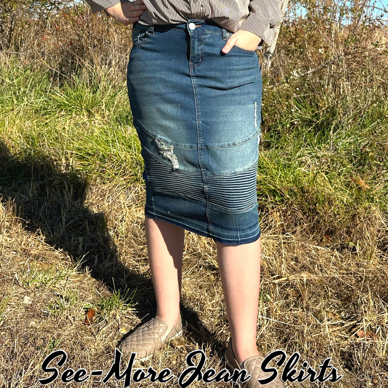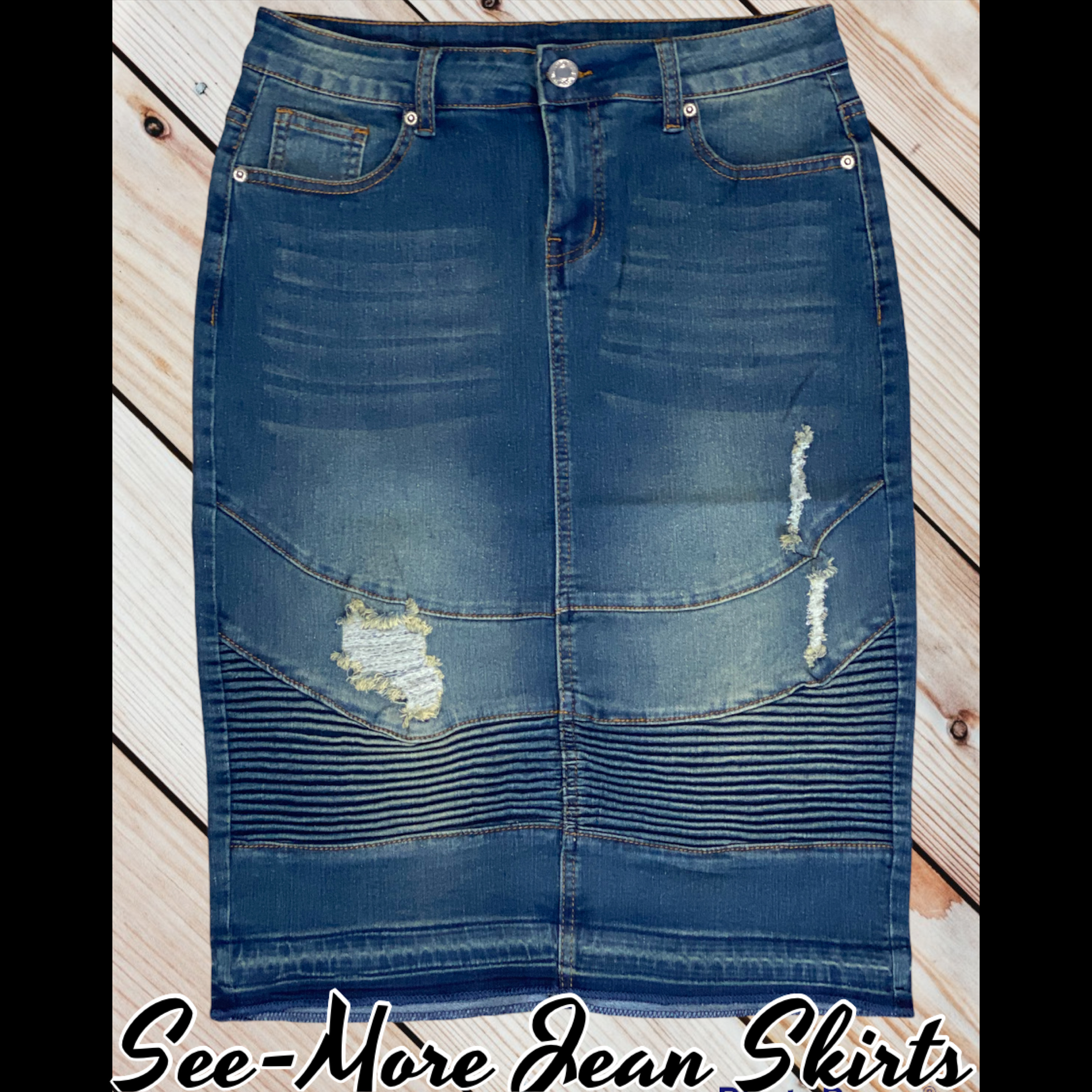 Vintage Wash, distressed, pencil, moto skirt, raw hem, stretch denim, Front pleat detail, no slits Length: 26 Waist/Hip Measurements: XS: 26/36 S: 28/38 M: 30/38 L: 32/40 XL: 36/42 2X: 38/44 3X: 40/46