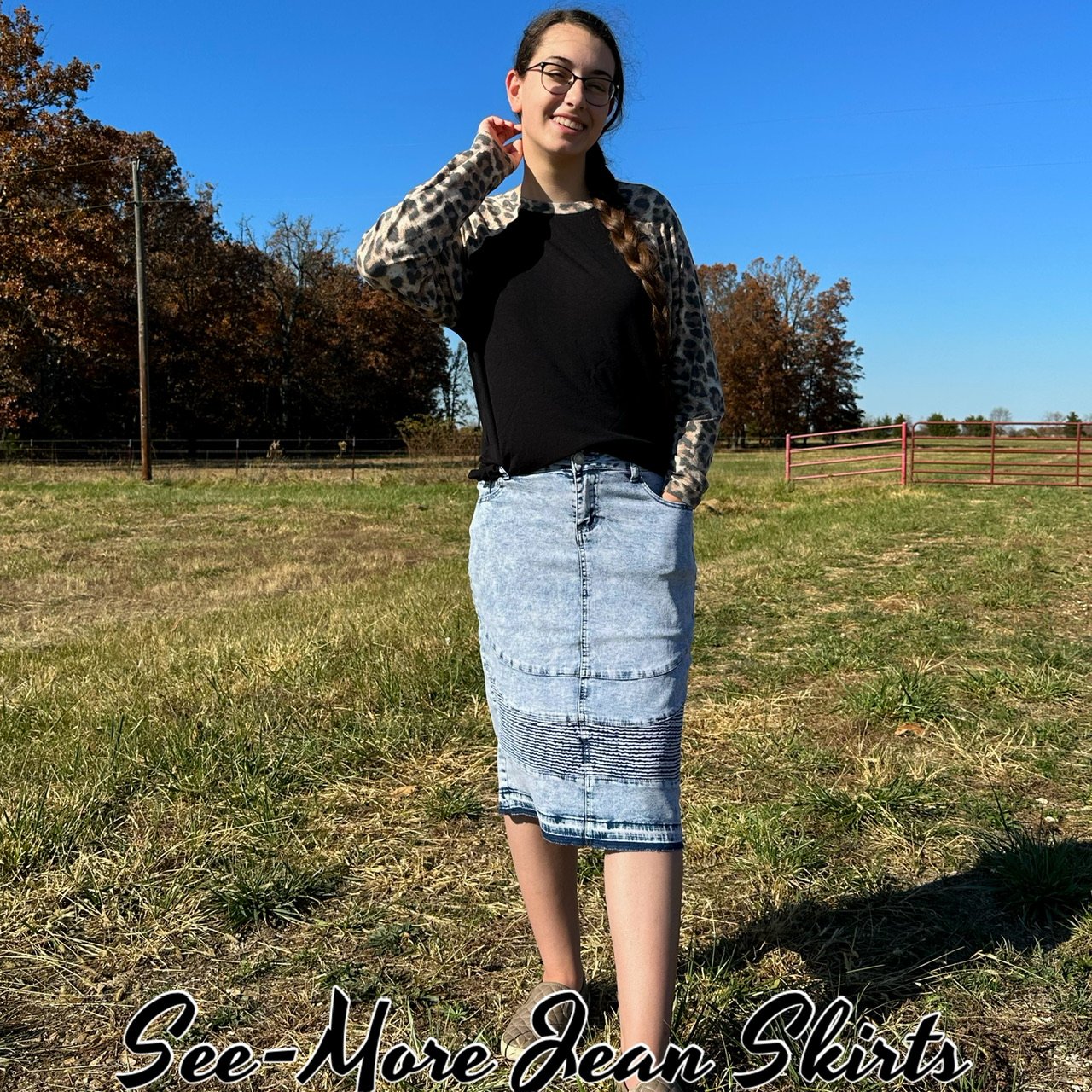 Sand Wash, pencil, moto skirt, raw hem, stretch denim, Front pleat detail, no slits Length: 26 Waist/Hip Measurements: XS: 26/36 S: 28/38 M: 30/38 L: 32/40 XL: 36/42 2X: 38/44 3X: 40/46