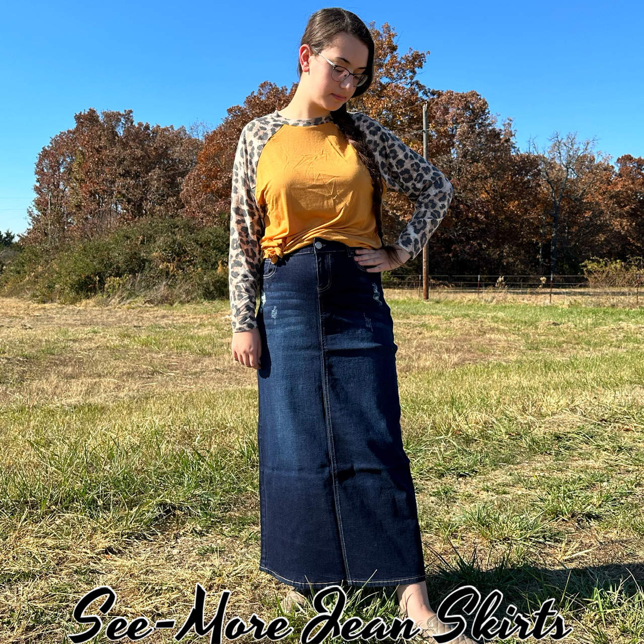 ASHLEY LONG DISTRESSED DARK DENIM SKIRT