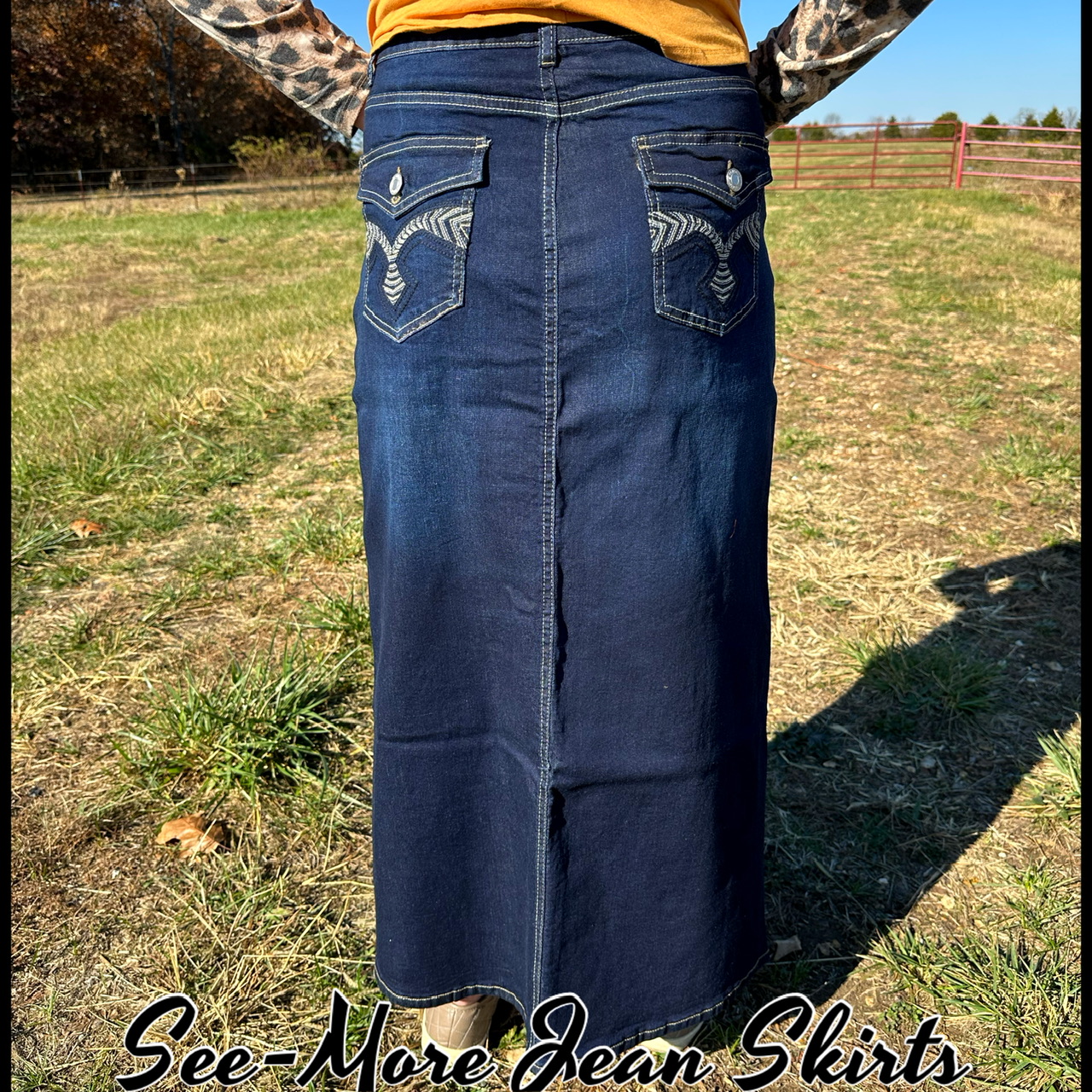 Distressed long skirt with embroidered pocket WAIST/HIP MEASUREMENTS: XS: 28/36 S: 30/38 M: 32/40 L: 34/42 XL: 36/44 2X: 38/46 3X: 40/48 Length: 37 2% Spandex for a little stretch