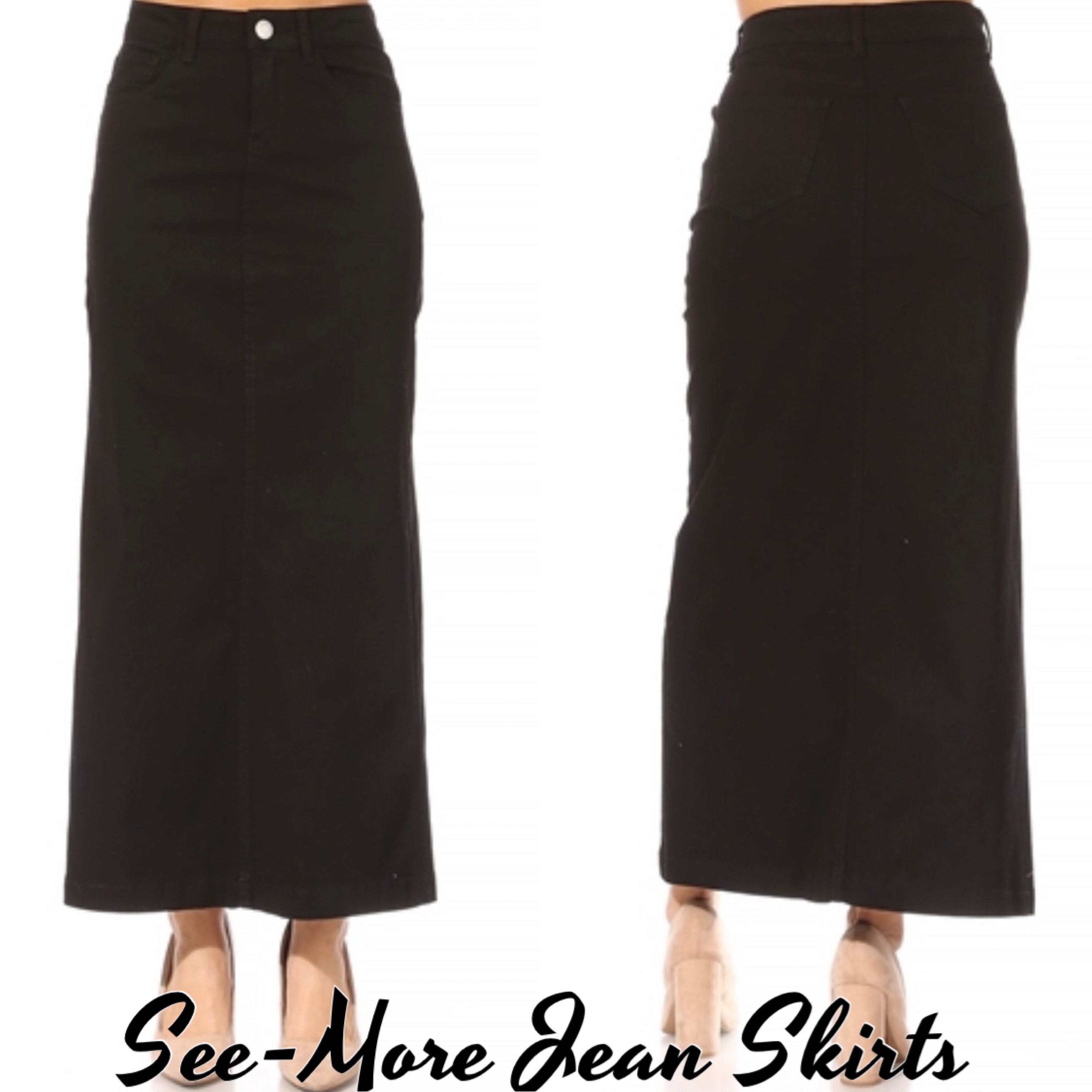 Stretch twill....5 pocket long skirt, no slit Length: 37 (Sizing up is recommended for looser fit) Waist/Hip Measurements: XS: 26/34 S: 27/37 M: 29/39 L: 32/42 XL: 34/44 2X: 37/46 3X: 39/48