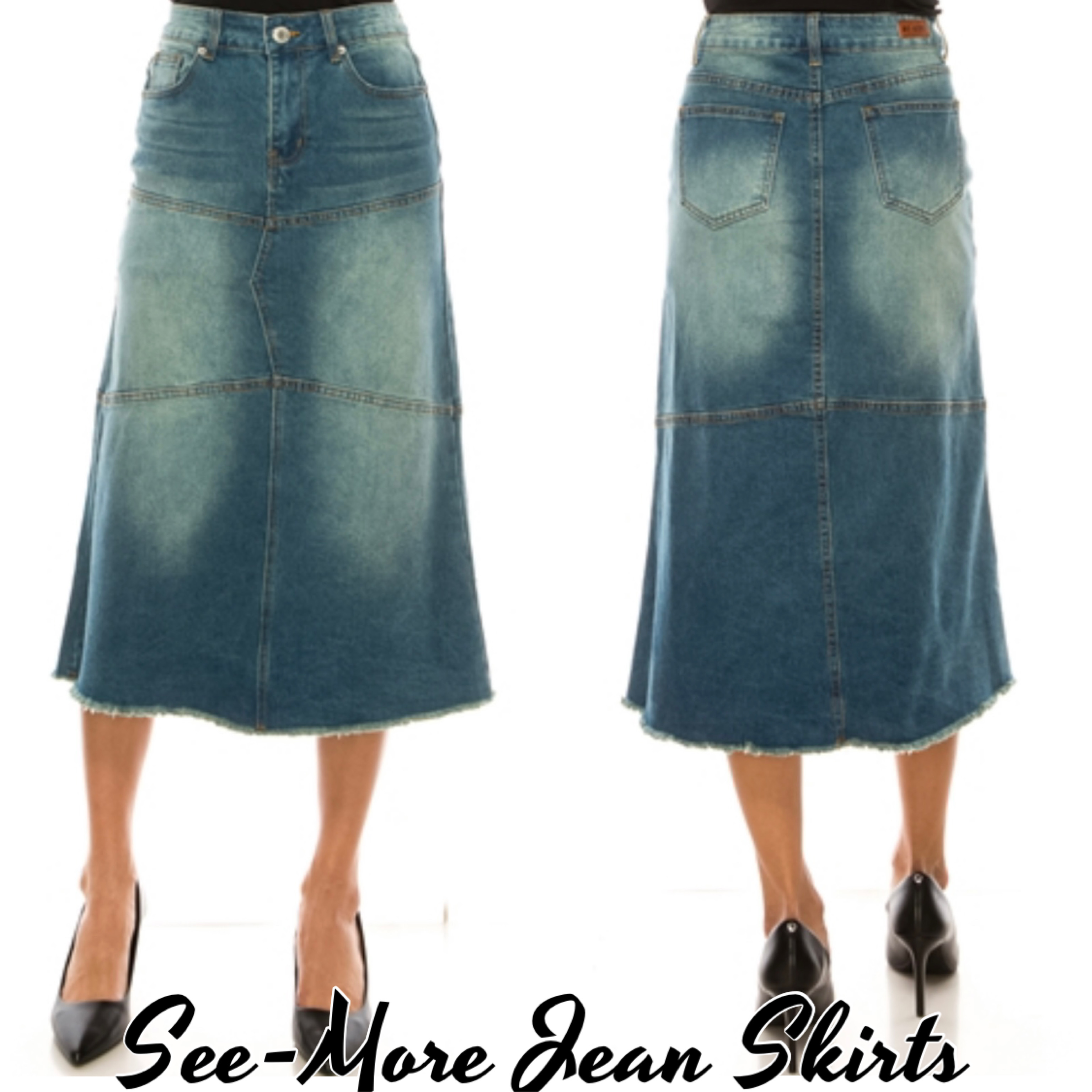 Stretch, Vintage Wash denim, A-Line, calf-length skirt, pockets front and back, no slits Length: 31 Waist/Hip Measurements: S: 28/36 M: 30/39 L: 33/42 XL: 36/44 2X: 38/46 3X: 40/48