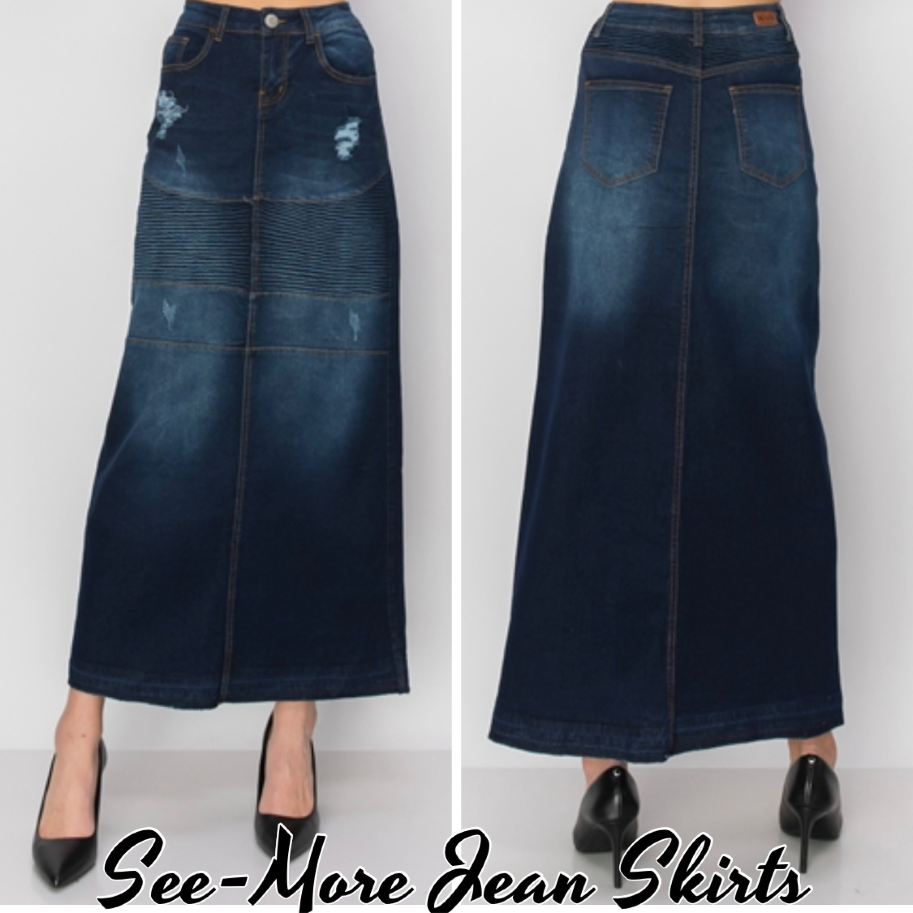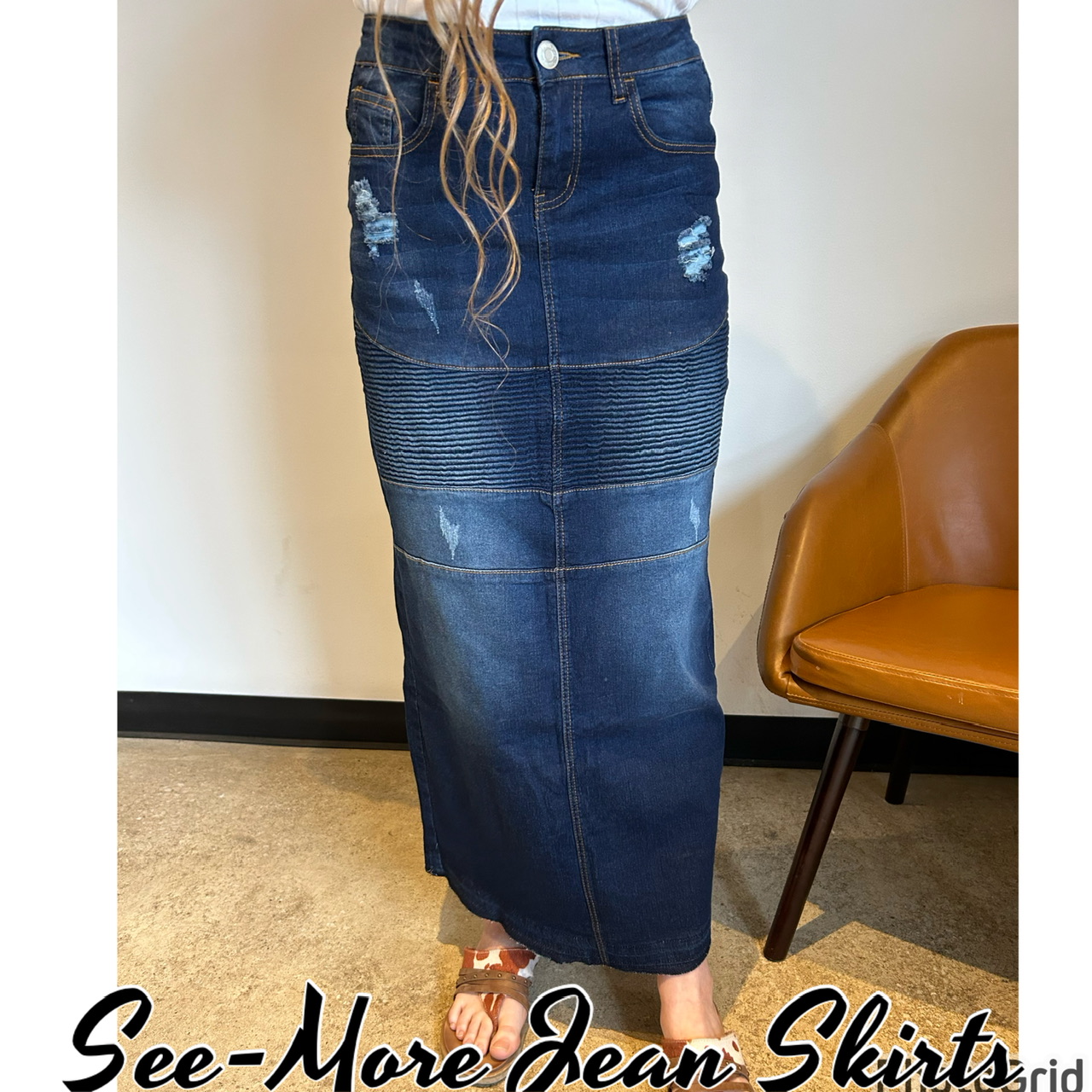Stretch denim distressed moto long skirt, raw hem, front and back pockets, no slit Length: 38 Waist/Hip Measurements: XS: 26/36 S: 28/38 M: 30/40 L: 32/42 XL: 34/44 2X: 37/46 3X: 40/48