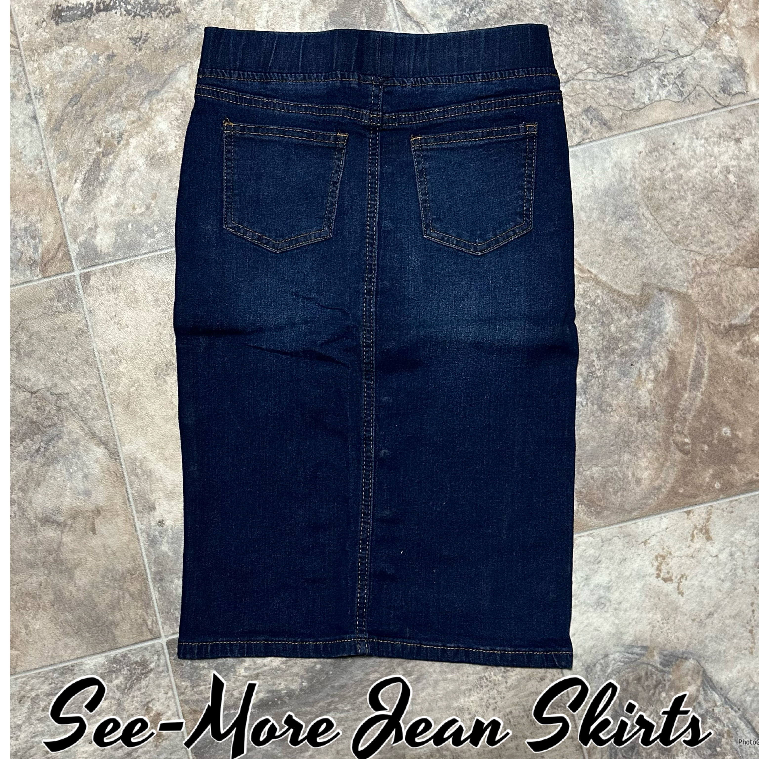 Dark, stretch, denim mid-length skirt, elastic waistband, button down embellished.