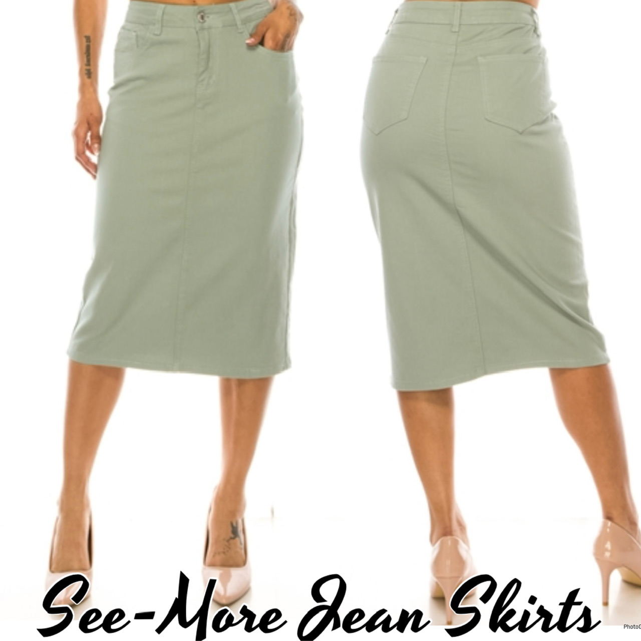 Stretch twill basic 5 pocket calf length, pencil skirt, no slit Length: 28 Waist/Hip S-29/38 M-31/40 L-33/42 XL-35/44 2X-37/47 3X-40/50